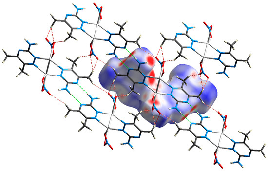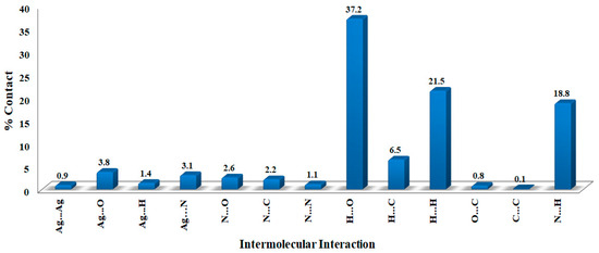 The molecules in the crystal are packed together to enhance crystal stability through a combination of intermolecular contacts. The Hirshfeld surface is a geometrical model utilized in supramolecular structure description to explain the packing and intermolecular contacts in the crystalline compounds [41]. The surface of Hirshfeld is the outermost boundary of the area where the studied molecule resides after it is crystallized [42,43,44]. The percentages of all potential intermolecular contacts in the crystal structure of [Ag(3ADMT)(NO3)]n are computed using fingerprint (FP) plots and summarized in Figure 6, which reveals that the O…H (37.2%), H…H (21.5%), N…H (18.8%), and C…H (6.5%) are the most abundant interactions.
