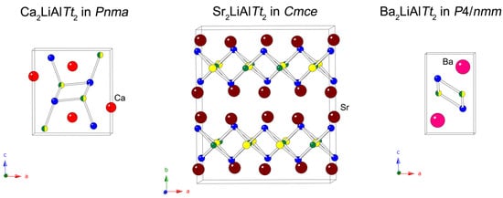 As seen from Table 1, Table 2 and Table 3 (as well as from Table 4, where the atomic coordinates of each of the six structures are given), there are three basic structures adopted by each of the Ca, Sr, and Ba compounds, respectively. All three types of structures (Figure 1) share a common feature—tetrahedral (or rather distorted tetrahedral) coordination of Al and Li atoms by the atoms of the Tt element. In the case of the Ca and Ba compounds, there is no long-range ordering and the refined models have Li and Al atoms occupying the same crystallographic positions, while in the case of the Sr compounds, there is no randomization and the derived crystal structures of Sr2LiAlSi2 and Sr2LiAlGe2 are devoid of disorder. Apparently, the packing of the AlTt4 and LiTt4 fragments together with the increasing size of the alkaline earth metal atom (in the expected order Ca < Sr < Ba) governs the formation of each structure, as it will be discussed in the next section. In that regard, we will mention that we attempted to synthesize Mg2LiAlSi2 and Mg2LiAlGe2 using the same synthesis procedure (elements in the targeted stoichiometric ratio loaded into niobium tube, arc welded shut, enclosed in a silica tube under vacuum, and heated in tube furnaces according to the same heating profile as for the Ca, Sr, and Ba counterparts). The resultant products were not the quaternaries Mg2LiAlSi2 and Mg2LiAlGe2. Instead, three different crystals could be identified with a naked eye: (1) blue, shiny gem-like crystals; (2) atmosphere-reactive silver crystals; and (3) dark, hard, brittle crystals. The blue crystals were determined by single-crystal X-ray diffraction to be cubic Mg2Si or Mg2Ge [25]. The other crystals could not be identified reliably. We posit that Mg is either too small to form structures comparable to the Ca, Sr, and Ba compounds detailed in this paper, or may form covalent bonds with Al and the Tt element. Reactions with the heavier congener of Si and Ge, Sn, were not explored as a part of this study due to time limitations.