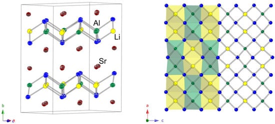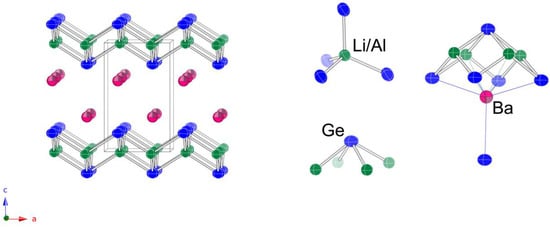 A schematic representation of the structure is given in Figure 3. The chosen view shows that the structure can be viewed as slabs made up of all edge-shared AlTt4 and LiTt4 tetrahedra parallel to the ac plane. The general topology of the 2D polyanionic substructure is reminiscent of the PbO-like layers that are frequently observed in the structures of many pnictides and chalcogenides [45,46,47], and analogous to the layers seen in the tetragonal structures of Ba2LiAlSi2 and Ba2LiAlGe2, which will be discussed next. The difference is that here, given that there is no Li/Al disorder, the exact positions of Li and Al atoms are known and the ordering pattern is checkerboard-like, with a repeating sequence of AlTt4 × 2 by LiTt4 × 2 (Figure 3, right panel).