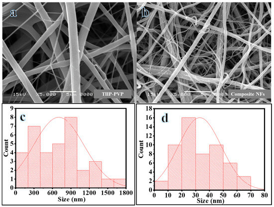 SEM images of obtained powder after calcination of TIIP-PVP (a) and composite NFs (b) at 800 °C in Ar and their respective average size (c,d).