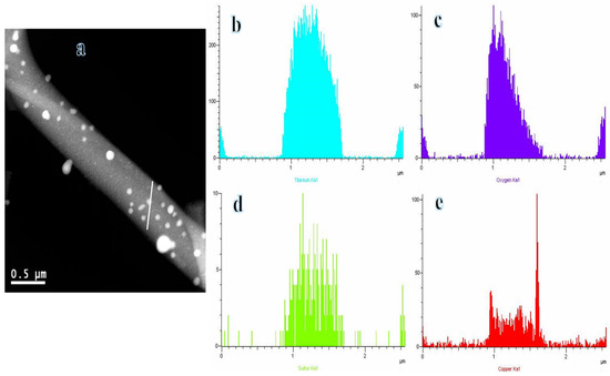 Figure 4a displays the STEM image of the composite NFs, showing the even dispersion of nanoparticles (NPs) inserted within the surface of the selected NF. TEM-EDX analysis was performed along the line indicated in Figure 4a, revealing that the distributions of Ti (Figure 4b), O (Figure 4c), S (Figure 4d), and Cu (Figure 4e) are consistent. Additionally, it has been observed that carbon is the furthest element. The protective carbon coating on the active NPs allows for their long-term preservation during catalytic processes.