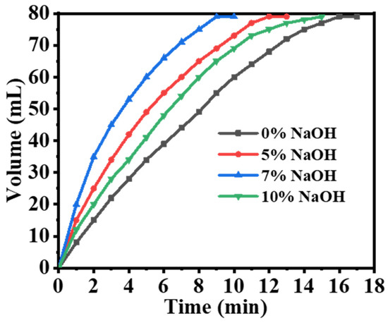 The hydrolysis reaction of SBH is highly sensitive to the alkalinity of the solution. The rate of hydrolysis in an alkaline solution is slower compared to that in pure water due to the hydrolysis of NaBO2, which produces NaOH [14,19]. Figure 5 illustrates the volume of H2 generated by varying concentrations of [NaOH] (0%, 5%, 7%, and 10%) when mixed with 50 mg of catalytic composite NFs and 1 mM of SBH at 25 °C and 1000 rpm. It can be observed that as the [NaOH] increased from 0% to 7%, the completion time of the SBH hydrolysis reaction decreased (17 min, 13 min, and 10 min, respectively). However, when the [NaOH] was further increased to 10%, an increase in the hydrolysis reaction completion time (15 min) was observed. This is likely due to the presence of OH in the hydrolysis of NaBH4. The HGR (hydrogen generation rate) can be enhanced by increasing the concentration of NaOH, which accelerates the catalyzed hydrolysis of SBH. However, if the NaOH concentration is too high, NaBO2 may become less soluble, precipitate out of the solution, and attach to the catalyst’s surface, obstructing its active sites [14]. This can hamper the contact between BH4+ ions and the catalyst’s surface, resulting in a slower rate of hydrolysis. Based on these findings, the addition of 7% NaOH to the composite NFs significantly enhanced H2 production, reduced reaction durations, and increased the volume of generated H2. Therefore, the optimal [NaOH] concentration for SBH hydrolysis catalysis was determined to be 7% for further kinetic investigations.
