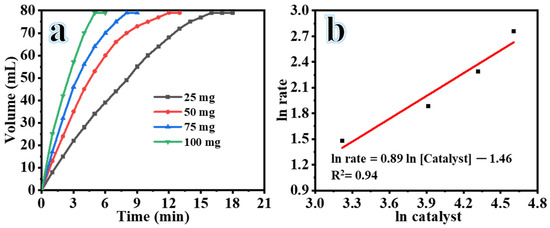 Figure 6a demonstrates a positive correlation between the amount of catalyst (ranging from 25 to 100 mg) and the volume of H2 generation in the presence of 1 mM SBH, 25 °C, 7% NaOH, and 1000 rpm. In the absence of a catalyst, only 13 mL of hydrogen gas was generated over a duration of 56 min. Although SBH is inherently unstable in atmospheric conditions, it exhibits a slow reaction rate with water in the absence of a catalyst, resulting in limited H2 production [33]. However, the introduction of a small amount of catalyst (25 mg) significantly increased the volume of H2 production within 18 min. Hydrolysis reactions were conducted with 50 mg, 75 mg, and 100 mg of catalyst, resulting in the production of 79 mL of H2 in 13, 9, and 6 min, respectively. The enhanced catalytic activity can be attributed to the increased specific surface area and exposure of active sites facilitated by the incorporation of composite NFs [34]. As the SBH hydrolysis process progressed, a decrease in the rate of H2 production was observed. This may be due to the formation of H2 aggregates and the blocking of active sites, hindering the generation of new active sites for subsequent catalytic cycles [34]. The H2 generation rate (HGR) was determined by analyzing the linear segment of each plot shown in Figure 6a. The logarithmic scale values of the HGR relative to the initial amount of composite NFs are depicted in Figure 6b. The slope of the straight line is close to first order (slope = 0.89), indicating that the catalytic hydrolysis of SBH follows a nearly first-order dependence on the catalyst amount.