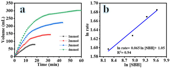 H2 production volume versus time from hydrolysis of SBH using different [SBH] at 25 °C, composite NFs amount = 25 mg, and 1000 rpm (a), and logarithmic plot of H2 production rate versus [SBH] (b).