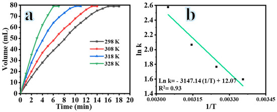 Figure 8a demonstrates the variation in the volume of H2 generated during the SBH hydrolysis process at different temperatures: 20, 30, 40, and 50 °C. The experiments were conducted using solutions containing 50 mg of composite NFs, 1 mM SBH, 7% NaOH, and 1000 rpm. As expected, an increase in temperature led to a decrease in the completion time of the SBH hydrolysis process and an increase in the rate of H2 generation. For example, the time required to reach a cumulative volume of 79 mL of H2 was 18, 14, 11, and 7 min at temperatures of 298, 303, 318, and 328 K, respectively. Previous studies [38] have shown that increasing the temperature results in a higher availability of highly active reacting molecules leads to an accelerated rate of H2 generation. This can be attributed to the increased kinetic energy and activity within the reaction system as the temperature is raised. Furthermore, the kinetic behavior of the SBH hydrolysis process catalyzed by composite NFs was studied at different temperatures (Figure 8b). The linear portions of the H2 production graphs at different temperatures were used to determine the rate constant (k) for the H2 production from the hydrolysis process. The relationship between k and 1/T is shown in Figure 8b. The apparent activation energy (Ea) was determined using the Arrhenius plot and equation. The slope of the straight line yielded an Ea value of 26.16 kJ mol–1 for the SBH hydrolysis catalyzed by composite NFs. Comparing the obtained Ea value with those of different catalysts for H2 production from SBH (Table 1), the prepared NFs exhibited a relatively low activation energy. This suggests that the composite NFs are efficient catalysts for the hydrolysis of SBH, resulting in a rapid reaction rate. The entropy (ΔS) and enthalpy (ΔH) of the hydrolysis reaction process were calculated using the Eyring equation and were found to be 0.044 kJ mol−1 K−1 and 23.56 kJ mol−1, respectively. These ΔH and ΔS values can be used to calculate ΔG using Equation (1) and rewritten in Equation (2) as follows: