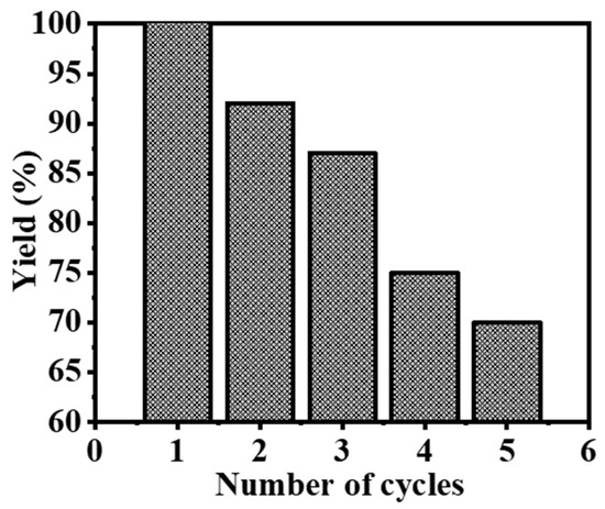 To assess the reusability of composite NFs as catalysts for the hydrolysis of SBH, identical experimental conditions were maintained (25 mg of composite NFs, 1 mM SBH, 7% NaOH, 25 °C, and 1000 rpm) in a recycling study (Figure 9). It was observed that the catalytic activity of the composite NFs declined after the third cycle. In the first cycle, the composite NFs were able to produce the full stoichiometric amount of H2. However, in the third cycle, only 87% of the total yield of produced H2 was collected. This decline in catalytic activity can be attributed to the accumulation of boron compounds such as NaBO2. These compounds can hinder the active sites of the catalyst and reduce its catalytic activity [45].