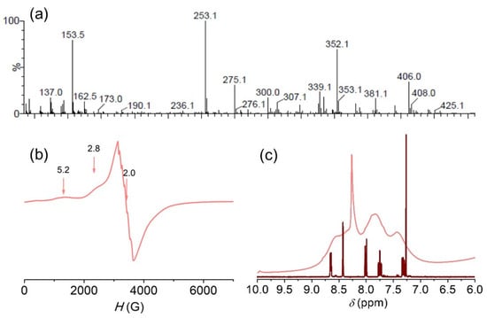 Infrared spectra were recorded in the 4000–400 cm−1 range on a Perkin-Elmer Spectrum One FTIR spectrophotometer provided with a DTGS detector, resolution = 4 cm−1 and 10 accumulations. FT-IR spectra were registered from KBr sample pellets. UV–visible spectra were recorded on a Jasco V-550 spectrophotometer (Jasco, Tokyo, Japan). Electron Paramagnetic Resonance (EPR) spectra were obtained at 115 K on an Elexsys E 500 Bruker spectrometer (Bruker, Billerica, MA, USA), operating at a microwave frequency of approximately 9.5 GHz and on a Bruker EMX-Plus spectrometer for measurements at Q-band. Electrospray ionization (ESI) mass spectra were obtained with a Thermo Scientific LCQ Fleet (Thermo Scientific, Waltham, MA, USA). The solutions for electrospray were prepared from solutions of complex diluted with methanol to a final ~10−5 M concentration. 1H NMR spectra were recorded on a Bruker AC 300 NMR spectrometer at ambient probe temperature (ca. 25 °C). Chemical shifts (in ppm) are referenced to tetramethylsilane and paramagnetic NMR spectra were acquired employing a superWEFT sequence, with an acquisition time of 80 ms.