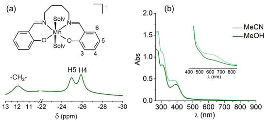 The Mn(III) complex 3 was obtained as a green solid by a reaction of Mn(ClO4)2, H2salbn and NaOH in a 1:1:1 mole ratio, in a methanol/ethanol mixture. From elemental analysis, the solid can be formulated as Mn2(salbn)2(OH)ClO4. The strong band at 774 cm−1 (Figure S4) together with the absorption at 3420 cm−1 in the FT-IR spectrum of this complex, suggest hydroxide may bridge the two Mn(III) ions [48,49]. The formation of the μ-OH bridged dimer in a mildly basic medium has precedent in previous reports for related Mn(III) complexes under similar conditions [50,51]. In line with this, the absorption band at 1648 cm−1, corresponding to the azomethine stretching vibration, is shifted to wavenumbers higher than in the free ligand, as also observed for other hydroxo-bridged diMn(III) complex [52]. Besides, the intense absorption bands at 1095 and 625 cm−1, confirm the presence of perchlorate as counterion. When the reaction was carried out employing Mn(ClO4)2, H2salbn and NaOH in 1:1:2 mole ratio, [(salbn)Mn(IV)(μ-O)]2 (4) was obtained as a brown solid, the FT-IR spectrum of which exhibits the characteristic four intense Mn-O stretching bands at 650, 631, 619, 603 cm−1 of the Mn(IV)(μ-O)2Mn(IV) core [53], well different from those of 3. Upon dissolution of 3 in a protic solvent, protonation of the hydroxide occurs and mononuclear [Mn(salbn)]+ (3+) forms, as verified by its 1H NMR spectrum in D4-methanol (Figure 4a). The paramagnetic 1H NMR spectrum of the complex reveals a simple pattern of three resonances outside the diamagnetic 0–10 ppm region. One broad resonance at 12 ppm attributed to the central –(CH2)2– protons of the aliphatic chain, and two up-field paramagnetically shifted resonances at −25 and −26 ppm, which can be assigned to H5 and H4 aromatic ring protons on the basis of comparison with reported spectra for related Mn(III) complexes [54,55]. By contrast, antiferromagnetically coupled diMn(III) species show sharper signals within or closer to the diamagnetic region [51], absent in the paramagnetic 1H NMR spectrum of 3+. Because of their closeness to the Mn center, protons adjacent to the donor groups of the Schiff base ligand (aromatic H3 and H6, N=CH- and CH2-N=C) are not observed in the explored spectral window (200 to −200 ppm) [56]. The equivalence of protons of the two aromatic rings indicates that the tetradentate Schiff base ligand is symmetrically arranged around the Mn(III) ion [54,57,58].