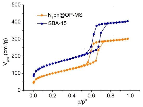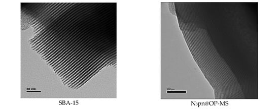The two materials display typical type IV isotherms with a sharp step and an H1 hysteresis loop at relative pressure p/p0 = 0.5–0.7 [68] that evidences the azido functionalized material exhibits similar mesopore structure and uniform size distribution as SBA-15 (Figure 6). N3pn@OP-MS possesses well-defined pores of similar diameter as SBA-15, although smaller volume and BET surface area (Table 1), as a consequence of the presence of the azidopropyl chains.