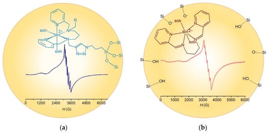 Low temperature X-band EPR spectra of complexes inside the pores. (a) Mn-pypntriazole@OP-MS and (b) 2@SBA-15. T = 120 K, ν = 9.3 MHz.