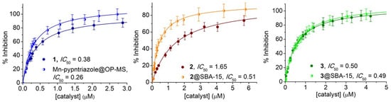 Prior to the SOD activity essays, the stability of the free and immobilized complexes in phosphate buffer was verified. UV–Vis spectra of the complexes 12+, 22+ and 3+ registered after incubation in phosphate buffer of pH 7.8 for 2 h (Figure S7) showed constant spectral features and band intensities. Additionally, analysis of supernatant after centrifugation of suspensions of the hybrid materials incubated in phosphate buffer, evidenced the absence of complex leaching into the solution. Therefore, the activity of these materials, if any, must be due to the immobilized complex. The SOD activity of complexes 12+, 22+ and 3+, and the hybrid materials, was measured by the Beauchamps and Fridovich indirect assay using NBT in a phosphate buffer of pH 7.8 [27]. In this assay, the NBT and the catalyst compete for the photogenerated O2•−, thereby the SOD activity is inversely related to the amount of formazan produced in the reaction of NBT with O2•−, detected at 560 nm. The IC50, the concentration of catalyst that diminishes by 50% the reduction of NBT by O2•−, was determined from plots of % inhibition vs. [complex], and used to calculate the McCord-Fridovich second-order rate constants kMcF = kNBT [NBT]/IC50, which are independent of the detector [28].