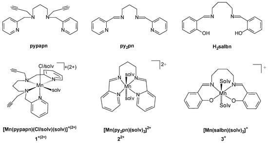 NTB, tris(2-benzimidazolylmethyl)amine; H2bpb, N,N′-(1,2-phenylene)bis(pyridine-2-carboxamide); HPClNOL, 1-[bis(pyridin-2-ylmethyl)amino]-3-chloropropan-2-ol; HPBMPA, N-propanoate-N,N-bis-(2-pyridylmethyl)amine; BMPG, N,N-bis[(6-methyl-2-pyridyl)methyl] glycinate; H2pyr2pn, 1,3-bis(pyridoxylidenamino)propane; salpn, 1,3-bis(salicylidenamino) propane; BIG, N,N-bis[(1-methyl-2-imidazolyl)methyl]glycinate; H2hbpapn, 1,3-bis[(2-hydroxybenzyl)(propargyl)amino]propane; salen, N,N′-bis(salicylidene)-1,2-diaminoethane; X: aromatic substituents. a In the aqueous medium, [Mn(II)(pypapn)(H2O)2]2+ (12+) is proposed to form through Cl−/water (DNH2O = 33) ligand exchange.