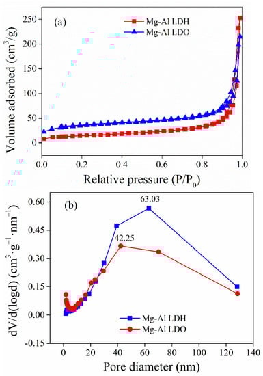 - Zeng, B.; Wang, Q.; Mo, L.; Jin, F.; Zhu, J.; Tang, M. Synthesis of Mg-Al LDH and its calcined form with natural materials for efficient Cr(VI) removal. J. Environ. Chem. Eng. 2022, 10, 108605. [Google Scholar] [CrossRef]