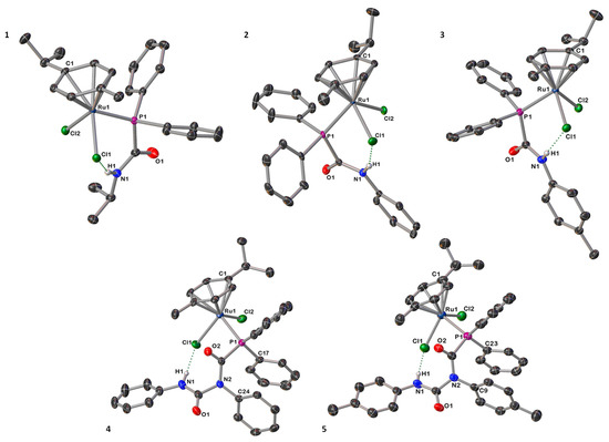 In parallel, the phosphinodicarboxamides PPh2C(=O)NPhC(=O)NHR (R = Ph L-4, p-tol L-5) [9] were reacted with [Ru(p-cym)Cl2]2 (Scheme 1) under similar conditions, affording [Ru(p-cym){PPh2C(=O)N(R)C(=O)N(H)R}Cl2]; {R = Ph (4) and p-tol (5)}. Unlike 1–3, complexes 4 and 5 are sparingly soluble in low-polarity hydrocarbons such as benzene and toluene. Characterization using NMR spectroscopy in CD2Cl2 indicate only one species in solution for compounds 1–5 (Table 1 and Table S1 and Figures S6–S15). These compounds possess bilateral symmetry in the p-cymene ligand as shown by 1H and 13C{1H} NMR spectroscopic determinations in solution. Thus, in the 13C{1H} NMR spectra of 1–5, the non-quaternary carbons of the p-cymene appear as two doublets, due to scalar coupling with the phosphorus atom of the PCA/PDCA ligand (2JCP = 4 and 6 Hz; see Figure S8) [26]. While the carbonylic PCA/PDCAs fragments are upfield-shifted with respect to their corresponding free ligand (L-1–L-5) (Table 1) (e.g., δC=O = 167 (1) vs. 175 (L-1) ppm), with a downfield shift observed in the 31P NMR spectra, upon complexation (e.g., δP = 29.8 (1) vs. −4.0 (L-1) ppm) (Figures S6–S15) [9,11,27,28,29]. Similar deshielding for the amide NH signals, is also observed in the 1H NMR spectra of compounds 1–3 (e.g., δH = 8.63 (1) vs. 5.35 (L-1) ppm). This is most likely a consequence of intramolecular hydrogen bonding interactions upon introduction of the [Ru(p-cym)Cl2] moiety (vide infra).