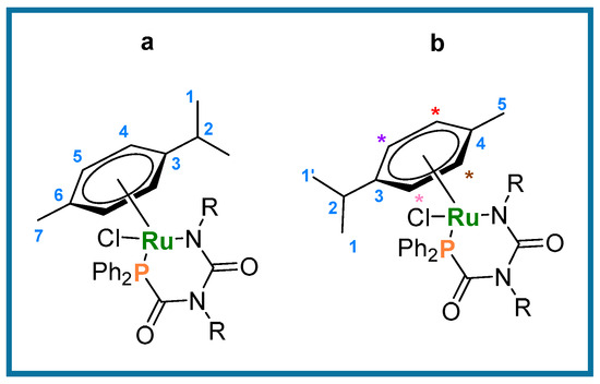 The phosphine (L-1 12 mg; L-2 6.9 mg; L-3 5.2 mg; L-4 6.9 mg; L-5 7.4 mg, 0.016 mmol) was dissolved in CD2Cl2 (0.4 mL) and added dropwise to a solution of [Ru(p-cymene)Cl2]2 (5 mg, 8.16 × 10−3 mmol) in CD2Cl2 (0.4 mL) with stirring, affording an orange solution. Volatiles were removed under vacuum, affording the target compounds 1–5. In the particular case of 2, the reaction was successfully scaled up, employing 50 mg (0.08 mmol) of [Ru(p-cymene)Cl2]2, with full characterization described below. Figure 3 shows the general numbering scheme used for the the p-cymene ligand in compounds 1–5.