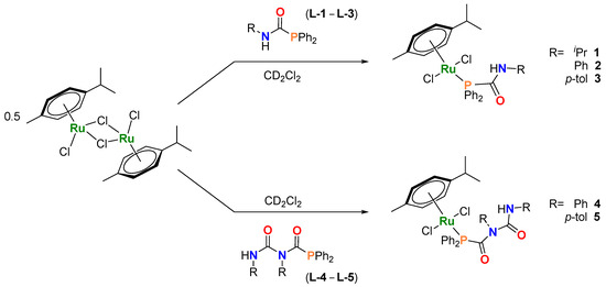 2.1. Synthesis and Characterization of [Ru(p-cym){PPh2C(=O)N(H)R}Cl2] [R = iPr (1), Ph (2), p-tol (3)] and [Ru(p-cym){PPh2C(=O)N(R)C(=O)N(H)R}Cl2] ([R = Ph (4), p-tol (5)]