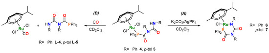 2.2. Synthesis and Characterization of [Ru(p-cym){κ2-P,N-PPh2C(=O)N(R)C(=O)NR}Cl] ([R = Ph (6), p-tol (7)]