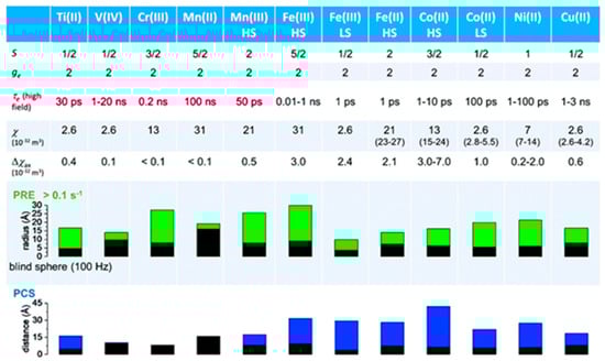 Typical values of electron relaxation time (τe), magnetic susceptibility (χ, spin-only values, equal to [μ0μB2ge2S(S+1)]/3KT and effective values, reported in parenthesis), and its axial anisotropy (Δχax) of transition metal ions. The typical radii of blind spheres (black) and spheres with 1H PREs larger than 0.1 s−1 (green) and the maximum distances of nuclei in axial position with PCSs of 0.05 ppm (blue) are also shown for a protein with the reorientation time of 10 ns at 700 MHz (HS = high spin, LS = low spin). Reproduced with permission from [9].