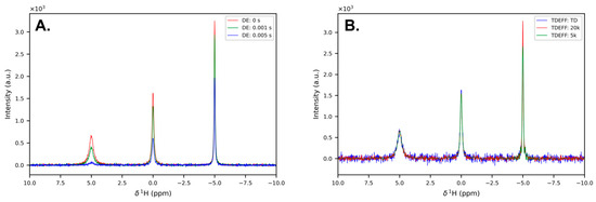 Simulation of 1D 1H NMR spectra for signals of different T2 (2 s−1, 5 s−1, 10 s−1) processed for different DE values (A) and at different TDEFF (B). A DW = 3 us and TD = 65 k data points were used, corresponding to effective acquisition times for the three spectra in (B) of 0.200 s, 0.0614 s, and 0.0154 s.
