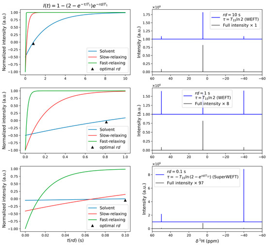 On the left, the normalized signal intensity curves for WEFT and SuperWEFT pulse sequences for 3 different relaxing signals: the solvent (T1 = 2 s, I = 1, 4.75 ppm), a slow-relaxing signal (T1 = 200 ms, I = 0.02, 50 ppm) and a fast-relaxing signal (T1 = 20 ms, I = 0.02, −40 ppm). The curves’ equation is reported above, and the optimal recycle delay (the time interval between two scans, also known as duty-cycle, rd) values are pointed out by the symbol ▲. On the right, the superposition of two spectra: in black, the full intensity spectra (rd = 10 s, τ = 10 s), and in blue, the reduced intensity spectra at different rd and optimal τ. rd is the delay that precedes the 180° pulse. τ is the delay between the 180° pulse and the acquisition pulse.