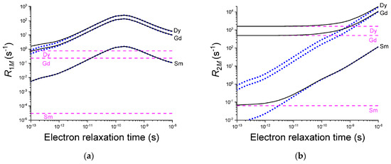 Solomon (dotted blue lines) and Curie (dashed pink lines) contributions to nuclear longitudinal (a) and transverse (b) paramagnetic relaxation (solid black lines) as a function of the electron relaxation time for samarium(III) (J = 5/2), gadolinium(III) (J = 7/2) and dysprosium(III) (J = 15/2). A non-exchangeable 1H nucleus was considered at a distance r = 10 Å from the paramagnetic metal in a molecule with a reorientation time τr = 10 ns in a magnetic field of 900 MHz proton Larmor frequency. Reproduced with permission from [21].