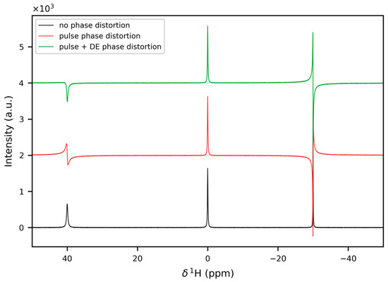 Simulation of 1D 1H NMR spectra for signals of different T2 (2 s−1, 5 s−1, 10 s−1) with pulse-induced phase distortion (red) and DE-induced phase distortion (green). The pulse-induced phase distortion is calculated using the equations in [32].