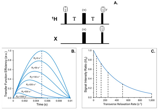 (A) pulse sequence for INEPT. The narrow and broad black rectangles denote 90° and 180° flip angle pulses, respectively. X refers to nuclei such as 13C or 15N. Τ delay is defined as 1/4JHX. The phase of the pulses is x when not indicated. (B), efficiency of the transfer function in the absence (R2 = 0 s−1) and in the presence of relaxation (R2 = 50, 130, 250, 500 and 1000 s−1). A dotted line, positioned at 0.005 s, is included to emphasize the maximum of the polarization transfer function in the negligible relaxation scenario. (C) The panel displays the Signal Intensity Ratio weighted by escalating transverse relaxation rates. Dotted lines are placed to highlight specific SIR values corresponding to each transverse relaxation rate utilized in panel B.