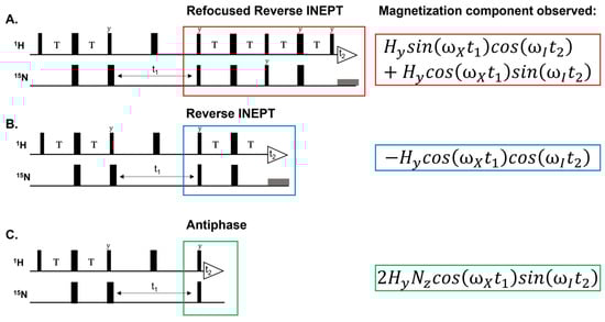 In modern heteronuclear NMR experiments, after the 13C (and or 15N) spin chemical shift evolution, the magnetization is transferred back to the 1H spin and then acquired. This is commonly accomplished with the reverse INEPT building block, with a duration equal to the initial INEPT, shown in Figure 9A. The refocusing of the -Hy component from the 2HxXz antiphase magnetization, followed by heteronuclear decoupling during the acquisition, gives rise to an in-phase singlet HN peak. The overall sensitivity of the experiment can be enhanced with the implementation of an additional spin echo building block, following the refocusing of the -Hy operator (Figure 9B). The sensitivity improvement scheme consists of a reverse refocused INEPT, which converts the 2HxNx double quantum coherence, which is unobservable with the reverse INEPT, into an additional and observable Hy single quantum coherence. As it appears immediately from the comparison of the two building blocks, the reverse refocused INEPT is a factor two longer than the reverse INEPT, resulting in severe magnetization loss for signals with large R2 values. Indeed, the sensitivity improvement schemes are only used when working with systems characterized by T2 relaxation rates longer than 4T (Figure 9). In paramagnetic systems, we are interested in modifying the HSQC experiment in order to make the back transfer from 15N to 1H spin as short as possible. This can be accomplished by starting the acquisition immediately after the two 90° pulses. The antiphase (AP) detected version of the 15N-HSQC experiment, called 15N-HSQC-AP, demonstrated that signals that are broadened beyond detection in standard experiments can be recovered in the AP version experiment. The 15N-HSQC-AP experiment acquires in t2 the antiphase component 2HxNz of the magnetization, generated by a 90°x radiofrequency pulse of the 15N spin after the chemical shift evolution and followed by the 90°y reading pulse, as shown in Figure 9C. In the absence of heteronuclear decoupling, 2HxNz evolves into an observable antiphase doublet. To minimize the cancellation of antiphase components, the spectra are processed with a 90° phase shift, and signals are analyzed as pseudo-singlets [53]. An additional advantage of this pulse sequence is that the removal of heteronuclear decoupling prevents the heating of the receiving coil, allowing for a faster recycling of the experiments. Combined, the short experimental duration and short duty-cycle permit an increase in the number of transients per experiment, with an overall improvement in the sensitivity for the paramagnetic signals and saturating conditions for the diamagnetic ones [54].
