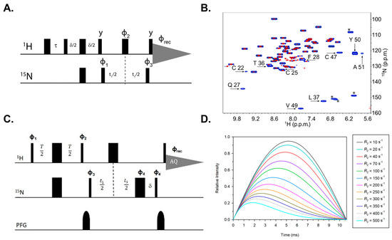 Several experiments have been designed to measure 1H R1 and R2 in paramagnetic systems. The general approach for R1 measurements is to edit an “existing” 2D experiment (e.g., NOESY or HSQC) with the previously described inversion-recovery building block [60] (Figure 10A,B). Depending on the choice of recycle and inter-pulse delay, the 180°-τ-90° block can be used to suppress solvent and slow relaxing signals with an “ad hoc” choice of the τ delay [52] (WEFT or superWEFT filter), as already described here in the section dealing with one-dimensional experiments. When a long recycle delay allows the complete magnetization recovery to equilibrium conditions, the experiment is used to measure longitudinal relaxation rates by running a series of experiments at variable τ values [61]. Both 15N and 13C HSQC are able to provide accurate measurements for R1 rates of backbone and side chain 1H spins (Figure 10A) [62]. In the case of R2, the usual editing scheme is a spin-echo filter inserted during or after an INEPT building block [63]. Unfortunately, the combination of spin-echo and INEPT periods prevents the identification of fast relaxing signals and, typically, allows accurate measurements of R2 < 50 s−1. To extend the measurements to a range of faster rates, the transverse relaxation delay can be directly embedded into an INEPT block (Figure 10C,D) in order to measure R2 values up to 400 s−1 [64,65].