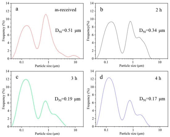 Particle size distributions of BiVO4 (a) as-received or treated with ball milling for (b) 2 h, (c) 3 h, or (d) 4 h.