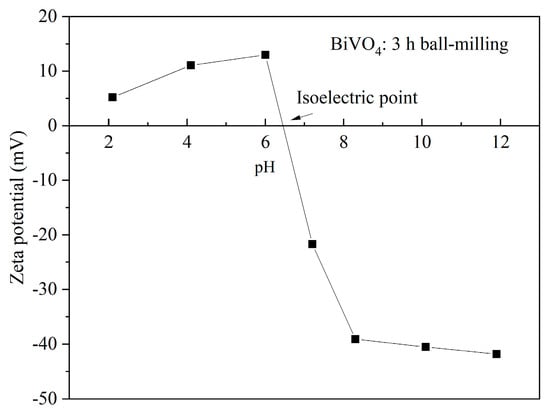 On the other hand, the dispersion of BiVO4 in the reaction system could directly affect the encapsulation effect. Therefore, we used the dilute HCl and NaOH aqueous solutions to adjust the pH value of the BiVO4 suspension and tested the corresponding zeta potentials. The isoelectric point of BiVO4 particles in an aqueous solution was around pH = 6.5 (Figure 2). Under acidic conditions, the surface of BiVO4 is positive, and the zeta potential is relatively low (<20 mV), which indicate the poor stability of the particles in aqueous solutions. Under alkaline conditions, the surface of BiVO4 is negative; especially when the pH value is above 8, the zeta potential is around −40 mV. The much higher zeta potential under alkaline conditions is beneficial for achieving the stable dispersion of BiVO4 particles to improve the encapsulation rate. In addition, OH− nucleophilic catalysis under alkaline conditions is conducive to the condensation of hydrolytic TEOS, contributing to a dense SiO2 layer []. In contrast, H+ catalysis under acidic conditions tend to form a linear connection of SiO2 precipitate with many hydroxyl groups on its surface, which can be easily combined with H2O and other solvents in the system via intermolecular H bonds, resulting in a loose and porous SiO2 layer. In addition, the resistance of BiVO4 powder to alkaline conditions is much better than to acid. Therefore, this work carried out the SiO2 coating process in an alkaline environment (pH ≈ 9.5).