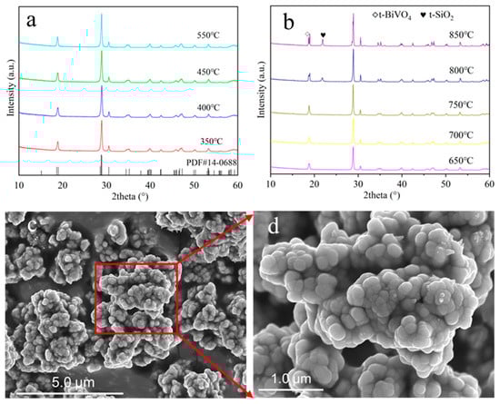 XRD patterns of BiVO4@SiO2 (a,b) calcined at different temperatures for 6 h. (c) SEM images of BiVO4@SiO2 encapsulated pigment calcined at 500 °C and (d) corresponding enlarged view of the selected area.