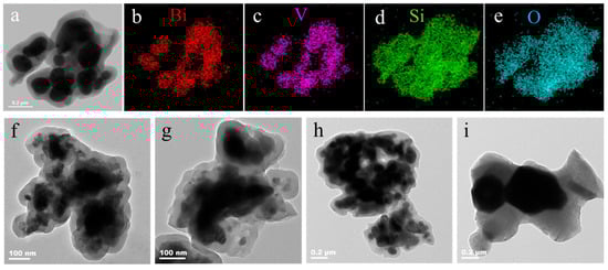 (a) TEM image and (b–e) corresponding EDS elemental mapping of BiVO4@SiO2 with 20 g of TEOS added and calcination at 500 °C. TEM images of BiVO4@SiO2 at different calcination temperatures of (f) 500 °C, (g) 600 °C, (h) 700 °C, and (i) 800 °C.