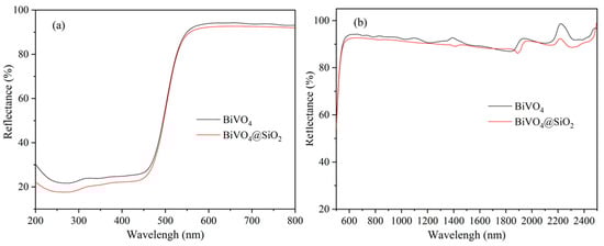To further elucidate the effect of SiO2 encapsulation on the color-rendering performance of the BiVO4 pigment, the UV–Vis diffuse reflectance properties were also investigated, as shown in Figure 6a. The BiVO4 and BiVO4@SiO2 pigments show a very close high reflectance (>90%) from the yellow to red bands in the wavelength range of 550–780 nm but a relatively low reflectance from blue to purple light in the wavelength range of 380–490 nm. Furthermore, the reflectance of BiVO4@SiO2 in the 380–490 nm wavelength range is slightly lower than that of BiVO4, which contributes to a little higher yellowness (b*) for the former []. In addition, the two samples had the same reflectance/absorption edge of about 500 nm in the green band, since BiVO4 is the main color-rendering substance, and thus they were endowed with a greenish tone (negative a* value). On the whole, the measured visible spectrum characteristics are consistent with the chromatic performance shown in Table 2 and Figure 5. The effect of SiO2 coating on the NIR reflectance performance of the BiVO4 pigment was also investigated, with results displayed in Figure 6b. Only a minor reduction in the NIR reflectance within the 780–2500 nm wavelengths could be observed when SiO2 coating with a high mass percentage of about 37.5% was introduced. Both samples possessed an overall sunlight NIR reflectance of more than 90%. The retained high NIR reflectivity of the BiVO4@SiO2 encapsulated pigment means that it has good prospects for being applied as a cold pigment for energy-saving applications such as architectural coatings, vehicle paints, exterior wall tiles, and other building decoration materials, since NIR radiation accounts for 52% of the energy from sunlight [,,,,]. Furthermore, the preparation cost of BiVO4@SiO2 is much lower than that of BiVO4 considering the ~37.5% SiO2 content. Therefore, from the perspectives of colorimetric performance, thermal stability, near-infrared reflectance, and cost, the obtained BiVO4@SiO2 pigment is an excellent candidate for “cool” roofs and energy-saving coating materials, having excellent weather resistance and thermal stability.