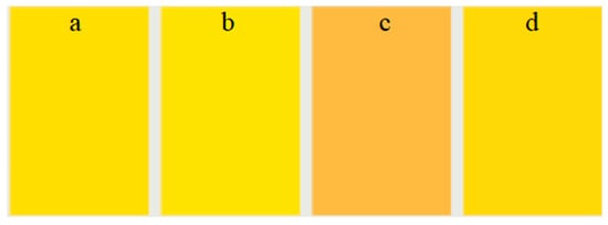 Chromatic coordinates of BiVO4@SiO2 at different calcination temperatures: (a) 500 °C, (b) 600 °C, (c) 700 °C, and (d) 800 °C.