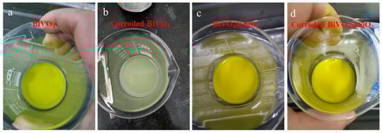 Photographs displaying the acid resistance of the pigments: BiVO4 (a) in water and (b) treated for 1 min in HCl solution; BiVO4@ SiO2 (c) in water and (d) treated for 90 min in HCl solution.
