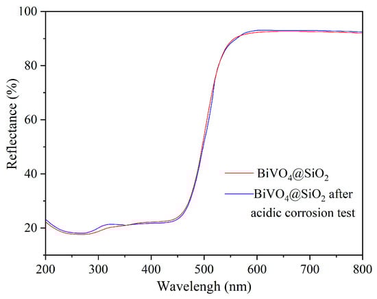Generally, BiVO4 has a poor resistance to acid corrosion. Thus, to test the effectiveness of SiO2 encapsulation in improving its acid corrosion resistance, SiO2-coated and uncoated BiVO4 pigments were treated with a 5 wt.% HCl solution for different durations. As shown in Figure 8, the as-received BiVO4 dissolved almost completely and lost its yellow color after placement in the HCl solution for only 1 min, while BiVO4@SiO2 showed no obvious change after 90 min under the same condition, retaining its vivid yellow color. Further, the UV–Vis reflectance spectra of the BiVO4@SiO2 pigment from before and after the acidic corrosion test are compared in Figure 9. No obvious change in reflectance spectral characteristics was found for the two samples. These findings clearly indicate that excellent acid corrosion resistance was achieved successfully for BiVO4 pigment through the modification with a silica coating. The obtained result also further suggests that the prepared amorphous SiO2 coating is sufficiently dense to prevent the penetration of acidic solutions. Considering that BiVO4 has good alkaline resistance, the prepared BiVO4@SiO2 pigment would have good application prospects in both acidic and alkaline coatings or paints.