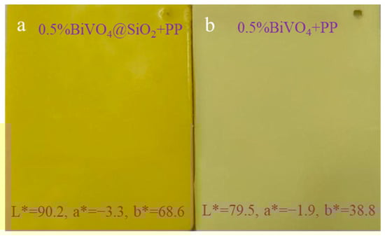 The environmentally friendly and nontoxic BiVO4 pigment is considered to be one of the most promising materials in plastic coloring applications [,]. However, in practical applications, it was found that pure BiVO4 pigment is vulnerable to the erosion by some plastic melts, resulting in degraded color-rendering performance. To investigate the influence of SiO2 encapsulation on the resistance to plastic melt of yellow BiVO4 pigment, the prepared BiVO4@SiO2 was well mixed into white polypropylene (PP) in a mass ratio of 5:1000, and then injection-molded into plastic plates at 240 °C. For comparison, the BiVO4-colored plastic sample was also prepared under the same conditions. It can be seen from Figure 10 that the BiVO4@SiO2-colored plastic plate exhibited a bright greenish-yellow color, while the color of the sample with BiVO4 was dull and pale yellow. Accordingly, the former possessed much higher L* and b* values. These results indicate that the SiO2 coating successfully enhanced the erosion resistance of BiVO4 pigment to high-temperature plastic melt, and the obtained BiVO4@SiO2 encapsulated pigment had a very strong tinting strength, even though the actual content of BiVO4 was only 0.32 wt.%. In short, the thermal and chemical stability, as well as the color performances, of the BiVO4 pigment can be effectively enhanced via SiO2 encapsulation modification, which is expected to greatly promote the application of this pigment in plastics, coatings, or paints, and even ceramics and glass surface decorations.