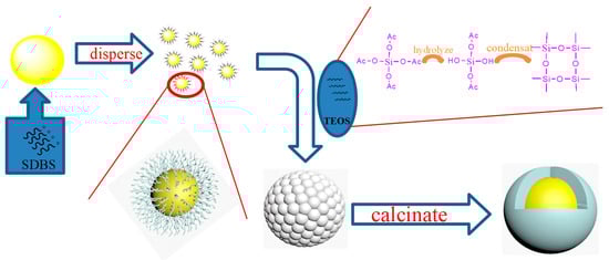 BiVO4@SiO2 pigment was prepared via a sol–gel method (Figure 11). The bismuth vanadate (BiVO4) pigment with a primary grain size of about 100 nm was synthesized at 350~400 °C and provided by Jiangxi Jinhuan Pigments Co., Ltd., Yichun, China. Before use, the pigment powder was treated with ball milling to ensure good dispersity. The reagents of AR-grade tetraethoxysilane (TEOS) and sodium dodecyl benzene sulfonate (SDBS) were purchased from Sinopharm Chemical Reagent Co., Ltd., Shanghai, China. In a typical synthesis, 10 g of BiVO4, 0.2 g of SDBS, and a certain amount of ethanol were mixed and ball-milled for 3 h to obtain the pigment suspension. Then, an ethanol solution of 20 g TEOS was added, and the mixture with a TEOS content of ~0.5 mol/L was mechanically stirred for 2 h. Subsequently, ammonium hydroxide (NH3·H2O, 28 wt.%, 20 g) was slowly added and stirred for 10 h. Finally, the mixture was dried at 75 °C for 12 h and then annealed at a certain temperature (400~850 °C) for 6 h under an air atmosphere to obtain BiVO4@SiO2 pigment.