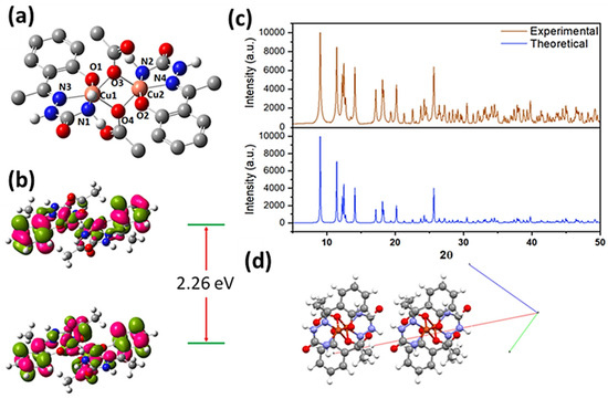 (a) Predicted structure of the complex, (b) HOMO-LUMO gap in the DFT study, (c) experimental and simulated powder X-ray pattern, and (d) the crystal packing of the complex.