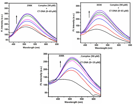 Emission profile of complex alone, and in the presence of CT-DNA at 298, 303, and 308 K.