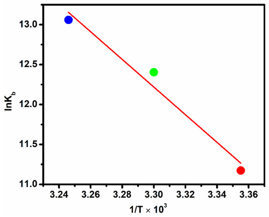 The thermodynamic parameters (ΔH and ΔS) have been calculated employing van’t Hoff’s equation at studied temperatures (Figure 4). The plot of ln Kb vs. 1/T gives the value of ΔH and ΔS for complex–DNA interaction as 143.91 kJ/mol and 358.76 J/mol K, respectively. These values suggest that the studied complex interacts with DNA in a hydrophobic manner [27] rather than through hydrogen bonding or Van der Waals interactions, and the complex’s spontaneous interaction with DNA is supported by the negative ΔG value (Table 1).