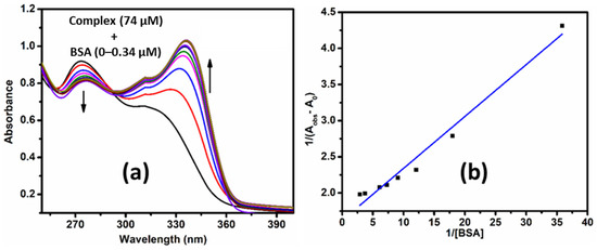 The absorption studies were performed in the absence and presence of various concentrations of BSA (0–0.34 µM) to the fixed amount of complex (74 µM) as shown in Figure 5a. On incremental addition of BSA, the absorption intensity of the complex at 319 nm is continually increased but it decreased at 274 nm because of the interaction between the complex and BSA. Isosbestic points at 257 and 293 nm direct the occurrence of reversible binding phenomena. The apparent association constant (Kapp) was achieved by implementing the following Equation (5):
