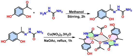 Methanol, DMF, 2, 4-dihydroxy acetophenone, semicarbazide, Cu(NO3)2·3H2O, and sodium acetate were purchased from Merck. BSA, CT-DNA, and ethidium bromide (EB) were procured from Sigma-Aldrich Chemicals Co. (Bengaluru, India) 4-(2-419 hydroxyethyl)-1-piperazineethanesulfonic acid (HEPES) buffer of pH 7.14 was utilized to prepare the reagent solutions needed for biological investigations. It was routinely performed to dry analytical samples at room temperature in vacuo prior to analysis. There were two Perkin-Elmer 2400 Series II C, H, N analyzers used to record microanalytical data for the current study.