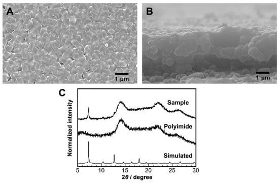 Preparation of ZIF-8 crystal films on a Zn2+-doped polymer substrate using the CH3COONa additive: to form a ZIF-8 crystal on the substrate, Zn2+-doped polyimide films were immersed in a solution (methanol/H2O = 1/2) containing 2-MeIM (100 mM) and CH3COONa (50 mM) followed by heating at 80 °C for 60 min. The SEM image of the obtained samples (Figure 1A) revealed that rhombic dodecahedral crystals with 396 ± 99 nm were densely formed on the substrate. In addition, upon observing the void areas wherein the polyimide was exposed, the crystalline films were not formed by stacked crystals on the polyimide surface, the resulting films consisted of a single-layered crystals. The cross-sectional SEM image also indicated the ZIF-8 crystals were densely packed and connected in the films, which indicates that continuous thin films without the void could be successfully prepared by the present approach (Figure 1B). The MOF thin films were found to pass a scotch tape test (adhesive force > 1.18 N cm−1). This may have been caused by the chemical interaction between zinc ions of MOF crystals and carboxylic groups of substrates. XRD measurements of the obtained sample confirmed the formation of ZIF-8 crystals on the polyimide substrate, and a characteristic peak originating from (110) plane of ZIF-8 was observed around 7.3 degrees, and all other peaks with weak intensity were assigned to the simulated ZIF-8 and halo patterns of the polyimide (Figure 1C). Moreover, XPS measurement of the obtained sample showed that the binding energy of 2p3/2 orbital of Zn was observed at 1022.0 eV, which is consistent with the literature value [43], indicating the formation of ZIF-8 crystals (Figure S1A).
