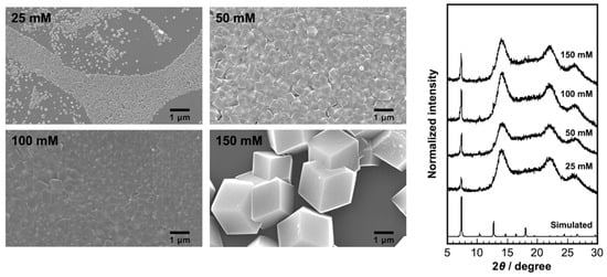 Influence of the concentration of 2-MeIM and the CH3COONa additive: The influence of the concentrations of the CH3COONa additive and 2-MeIM on the number and size of the obtained ZIF-8 crystals is summarized in Figure 3. First, focusing on the effect of the CH3COONa additive concentration, at a ligand concentration of 100 mM, as the additive concentration increased, the crystal size increased without a significant change in the number of crystals. Interestingly, larger crystals are sparsely formed on the substrate at an additive concentration of 150 mM. At a ligand concentration of 200 mM, a similar trend is observed for additive concentration in the range from 25 to 150 mM. In addition, ZIF-8 crystals are densely formed and interconnected with the substrate at additive concentrations greater than 50 mM. As mentioned above, at low additive concentrations below 25 mM, the present approach leads to a nucleation-rich process. Conversely, at higher additive concentration, the crystal growth of ZIF-8 became a preferential process, resulting in the formation of larger-sized ZIF-8 crystals.