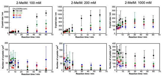 Changes in the size and number of the crystals prepared using reaction solutions containing different concentrations of 2-MeIM and CH3COONa.
