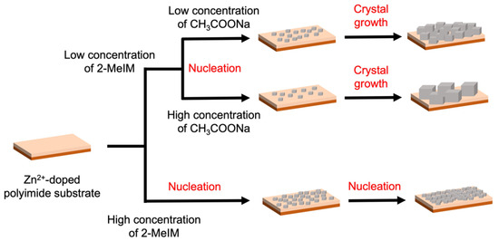 Herein, we propose a simple strategy for depositing continuous amine-based MOF (ZIF-8) crystal films on metal-ion-doped polymer substrates using basic salts, such as sodium acetate, instead of neutral sodium nitrate. A sodium acetate solution induces an ion-exchange reaction between the doped metal ions in the polymer substrate and the sodium ions, resulting in the elution of the doped metal ions from the substrate. After this ion-exchange reaction, all the eluted metal ions are consumed on the surface of the substrate, either via complexation with organic ligands or the formation of zinc hydroxide. Subsequently, zinc hydroxide is converted to ZIF-8 in the presence of excess organic ligands via a replication reaction [39,40,41,42]. This methodology allows understanding of the basic principles of MOF crystal formation, and provides important insight into the fabrication of continuous MOF crystal films.