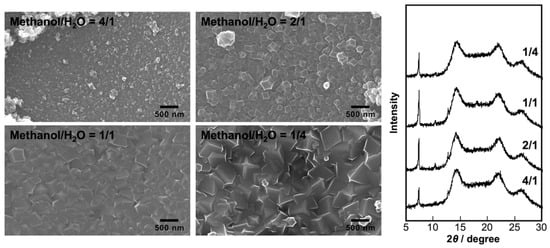 The effect of the methanol/H2O mixing ratio on the surface morphology of ZIF-8 crystal films: In the preparation of ZIF-8 crystals by conventional hydrothermal synthesis, the size of crystals depends on the solvent, with smaller-sized crystals forming in methanol solution and larger-sized crystals forming in aqueous solution. Therefore, the effect of the methanol/H2O mixing ratio on the surface morphology of the resulting samples was also investigated. To form a ZIF-8 crystal on the substrate, Zn2+-doped polyimide films were immersed in a solution with various methanol/H2O mixing ratios containing 2-MeIM (100 mM) and CH3COONa (50 mM), followed by heating at 80 °C for 60 min. Surprisingly, ZIF-8 crystals were not formed on the substrate when the reaction was performed with only methanol solution. This may be due to the fact that the reaction temperature (boiling point: 64.7 °C) was too low to form frameworks. On the other hand, as the ratio of H2O in the reaction solution was increased, the number of crystals decreased and the size of crystals increased, indicating that higher content of H2O in the reaction solution led to a growth-rich process (Figure 6). XRD measurements revealed that the crystals formed in all samples were ZIF-8 frameworks. However, there were variations in the intensity of peak derived from the (110) plane of ZIF-8 framework. In the case of the higher content with methanol, the crystallinity of the resulting sample may be expected to be lower due to rapid nucleation. A decrease in peak intensity was also observed in the case of higher H2O content. This may be caused by the degradation of the -ZIF-8 crystals formed during the reaction. These results demonstrated that continuous ZIF-8 crystal films with controlled sizes can be formed by changing the ratio of methanol/H2O in the reaction solution.