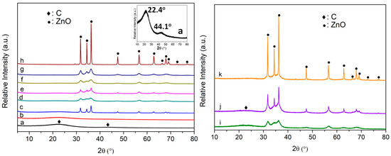 XRD patterns of the fresh catalysts: (a) N-C; (b) 5ZnO-N-C; (c) 10ZnO-N-C; (d) 20ZnO-N-C; (e) 20ZnO-N-C-air; (f) 30ZnO-N-C; (g) 40ZnO-N-C; (h) ZnO. XRD patterns of the spent catalysts: (i) 20ZnO-N-C (GHSV = 840 h−1, T = 600 °C, t = 2.5 h); (j) 20ZnO-N-C (GHSV = 840 h−1, T = 580 °C, t = 6 h); (k) 20ZnO-N-C-air (GHSV = 840 h−1, T = 600 °C, t = 2.5 h).
